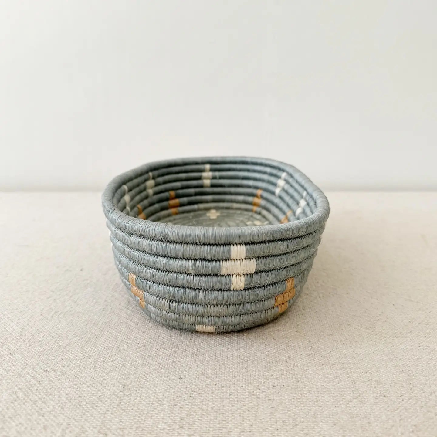 This sisal, woven bread basket is handmade by artisans in Gitarama, Rwanda in East Africa. The women hand-dye sisal fibers and weave them into these beautiful works of art. Use this basket to serve breads or as a centerpiece. It also comes with a string attached at the top so that you can hang it on the wall. In addition to making a beautiful table display, you can combine them with other baskets or works of art to make a wall collage.