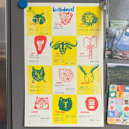 This birthday reference calendar is printed on toothy, textured cover stock with vibrant Risograph inks. Frame it, hang it, or tack it up and you'll (hopefully) never forget a birthday again! Designed by Egg Press and printed by our pals at @OutletPDX in Portland, OR.