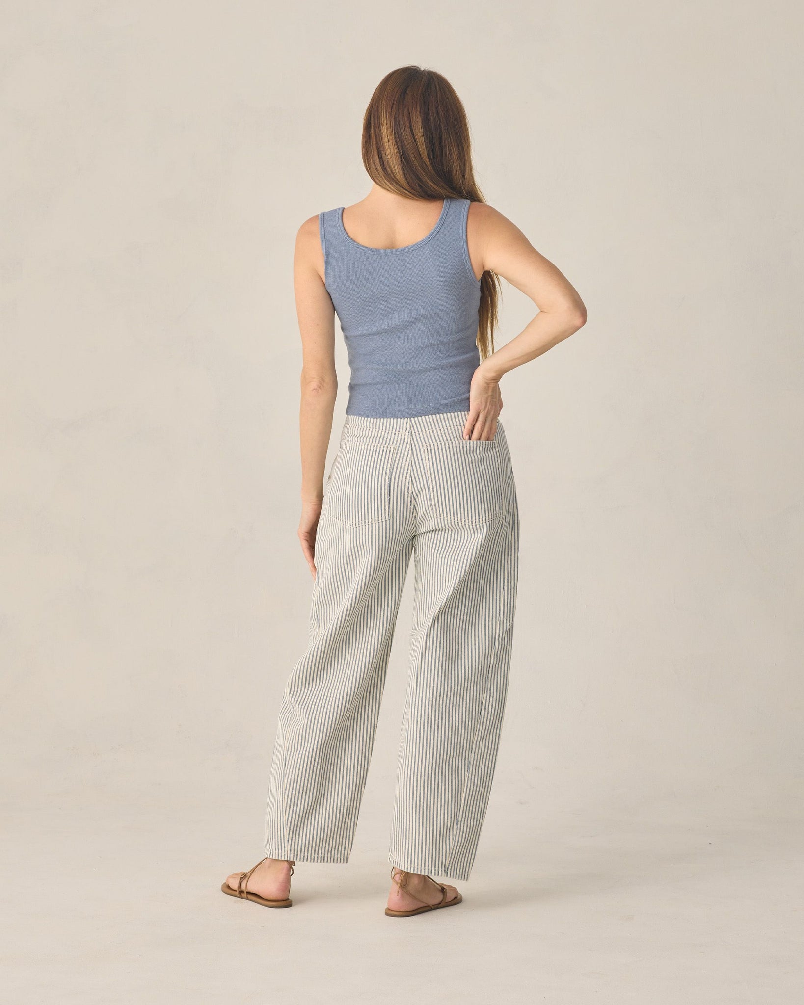 Featuring a 'railroad stripe' print on our 'natural' denim.