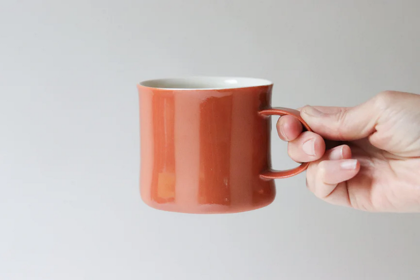 Drink your style in style with this pop of color. This wabi sabi mug was handbuilt from one rolled out slab of clay. It was carefully gathered and altered to become the shape of a cup, a handle was then added. The process is revealed in the details of the mug. It is glazed in clear on the inside with alternating stripes on the outside.