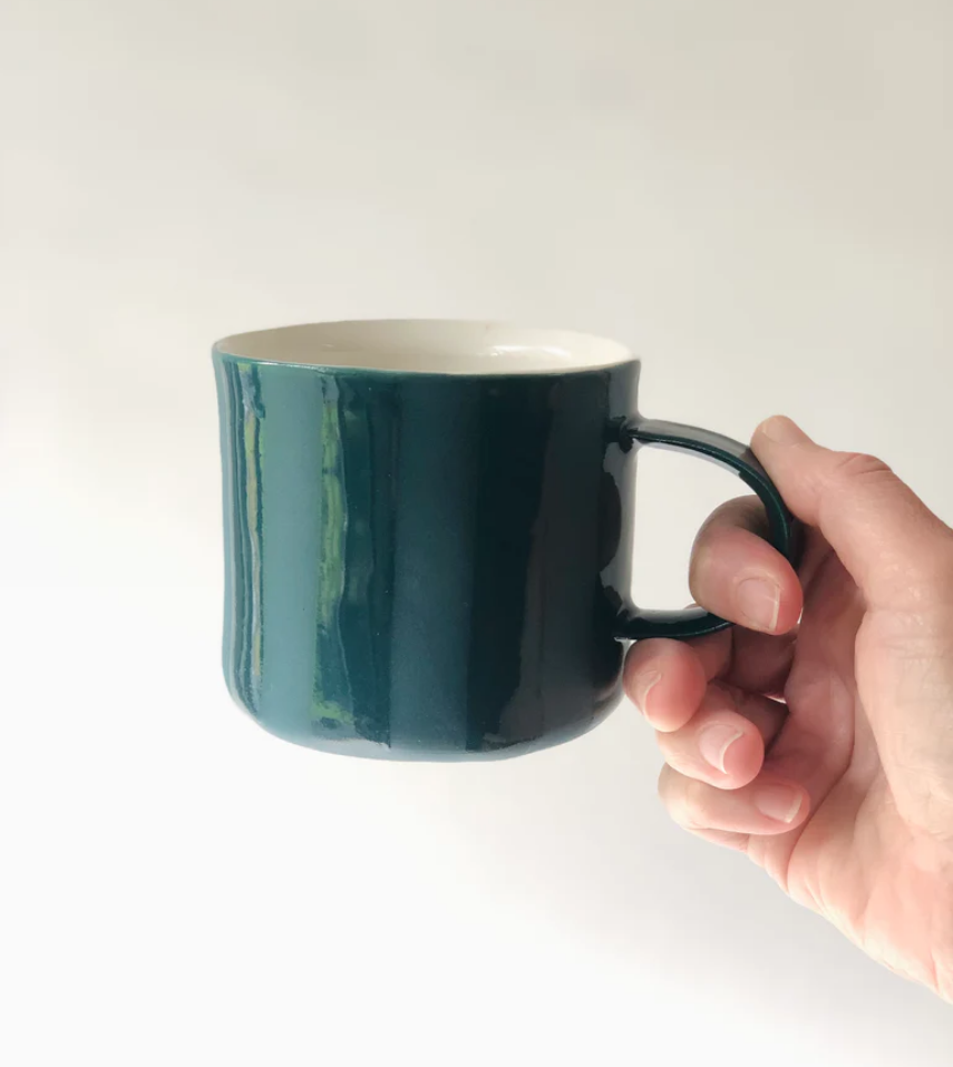 Drink your style in style with this pop of color. This wabi sabi mug was handbuilt from one rolled out slab of clay. It was carefully gathered and altered to become the shape of a cup, a handle was then added. The process is revealed in the details of the mug. It is glazed in clear on the inside with alternating stripes on the outside.