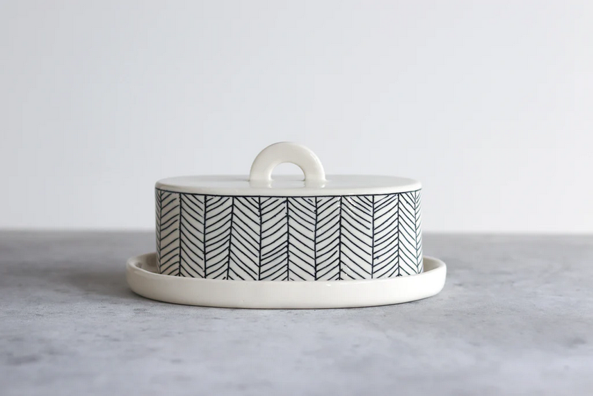 This butter dish is sure to catch your eye on the daily. It can joyfully rest on your counter with its intricate herringbone pattern. This special piece will be a conversation starter at your next dinner party.