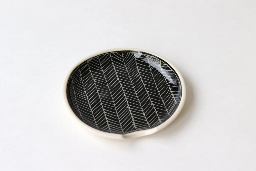Here is a great opportunity to display a functional piece of art. A spoon rest is a must to keep your stove clean, why not use one you love? This spoon rest is made from porcelain clay and hand carved. The pattern is carve out of with black stain and the dish is coated with clear glossy glaze.