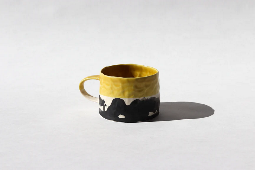 Elevate your morning routine with this handmade splatter mug. Featuring a unique dappled texture from pinched clay, it showcases a striking black abstract design beautifully contrasted with a delightful pop of colored glaze, making every sip a joyful experience. Perfect for coffee, tea, or your favorite warm beverage, this mug is both functional and a stunning statement piece.