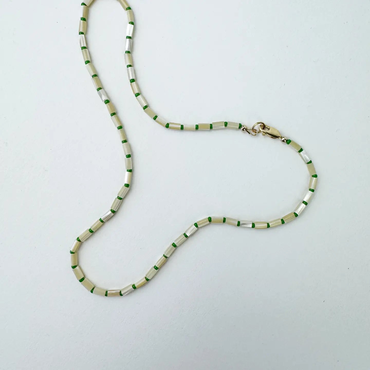 Mother of Pearl, Japanese Glass, Silk Thread, and Sterling Silver 10mm clasp.