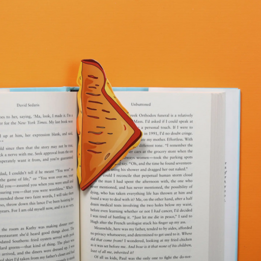 It's a grilled cheese sandwich in a book! Bookmarks are underrated... until you have a gooey cheesy sandwich that won’t leave grease stains sticking out of your thriller.