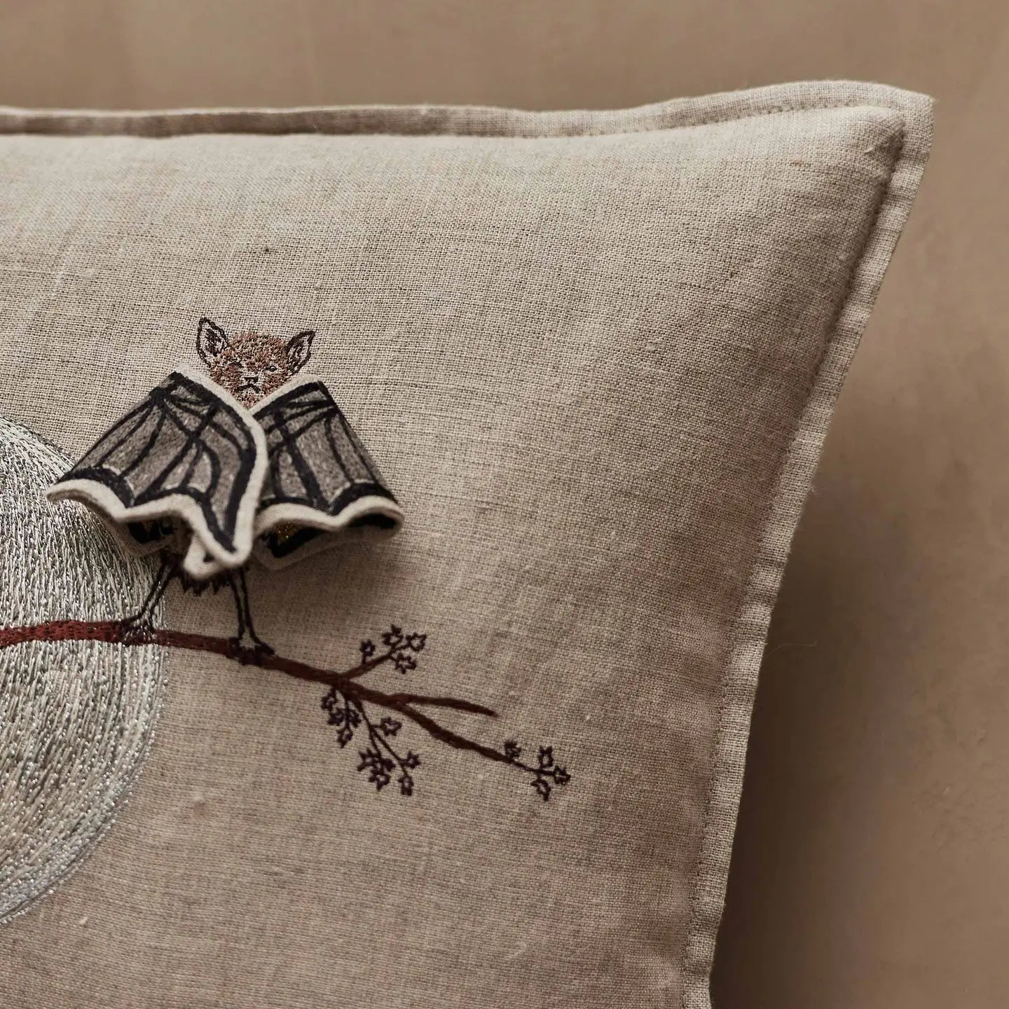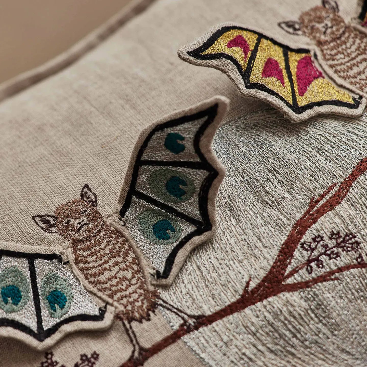As the full moon rises, three baby bats hang from a maple tree branch. Once night falls, the bats open their wings to fly, revealing the bright patterns of butterfly wings! Their interior wings are embroidered in metallic threads and bold colors. Pair with our Bat Wing Surprise pillow for a festive Halloween display.