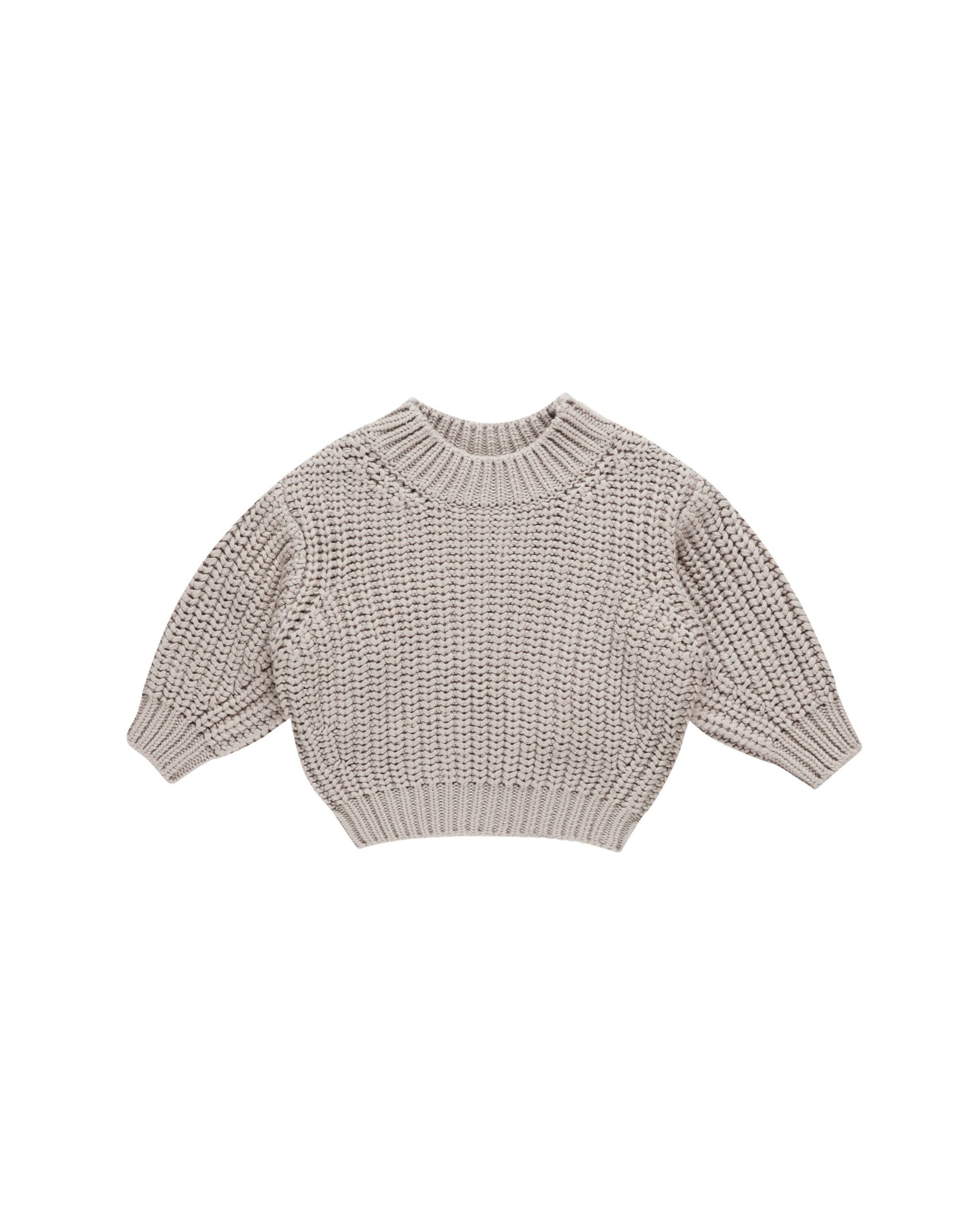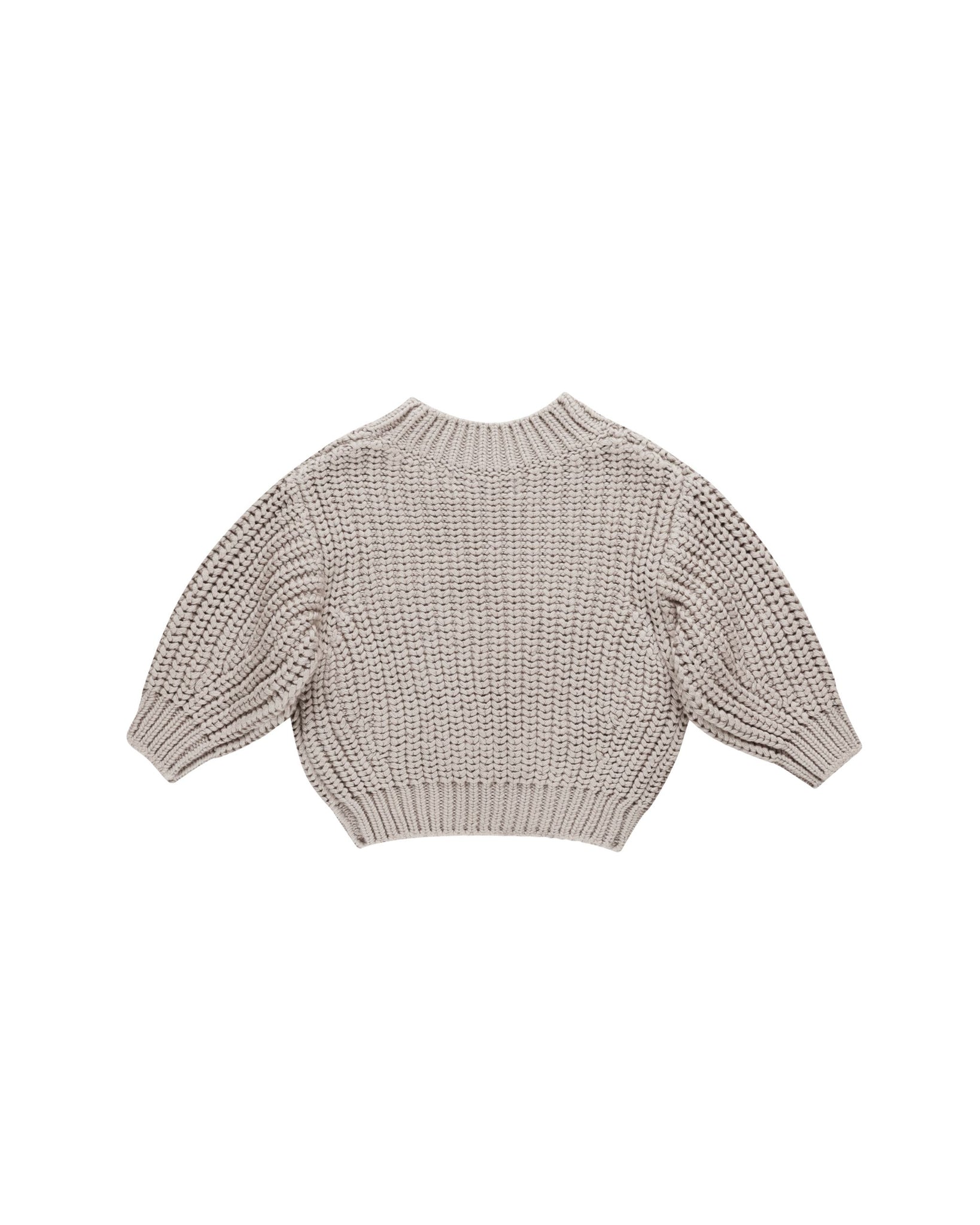 Adorable chunky knit sweater with ribbing at the sleeve and neck openings.