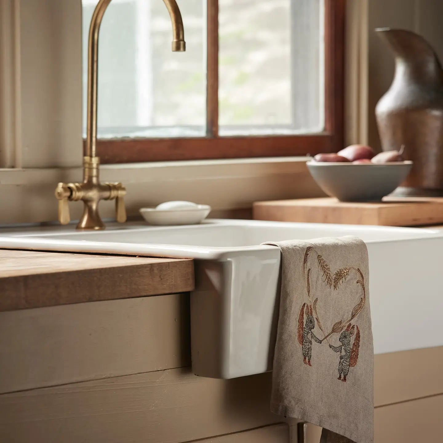A pair of squirrels celebrate the harvest, holding stalks of wheat that form the shape of a heart. Decorate for fall with the Squirrels and Wheat tea towel.